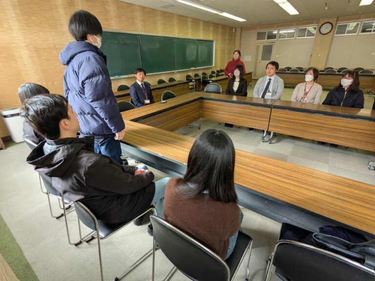就職先や実習での経験、身につけた専門性を、自分の言葉で先生方に伝える学生たち。P