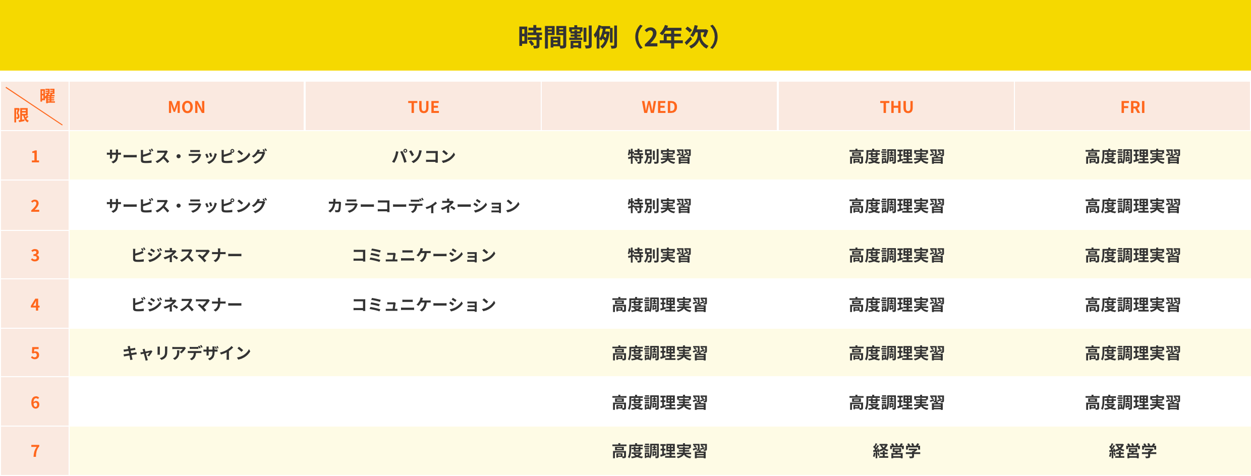 食を通してお客様に喜びを提供するためには、料理の技術はもちろんのこと、ホスピタリティや衛生面の管理など幅広い知識と教養が求められます。本科では現場を知り尽くした一流の教員による授業と全国トップクラスの実習量を通して、プロフェッショナルとして必要なスキルを2年間で磨き上げていきます。