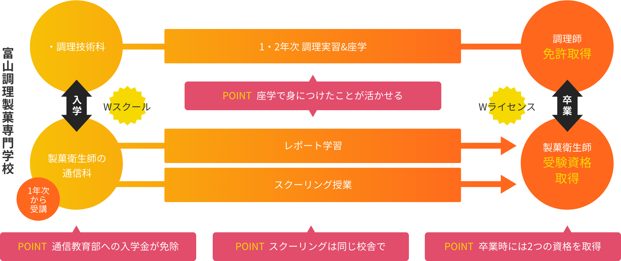 「調理師」+「製菓衛生師」の2つの「国家資格」の取得を目指せる制度です!